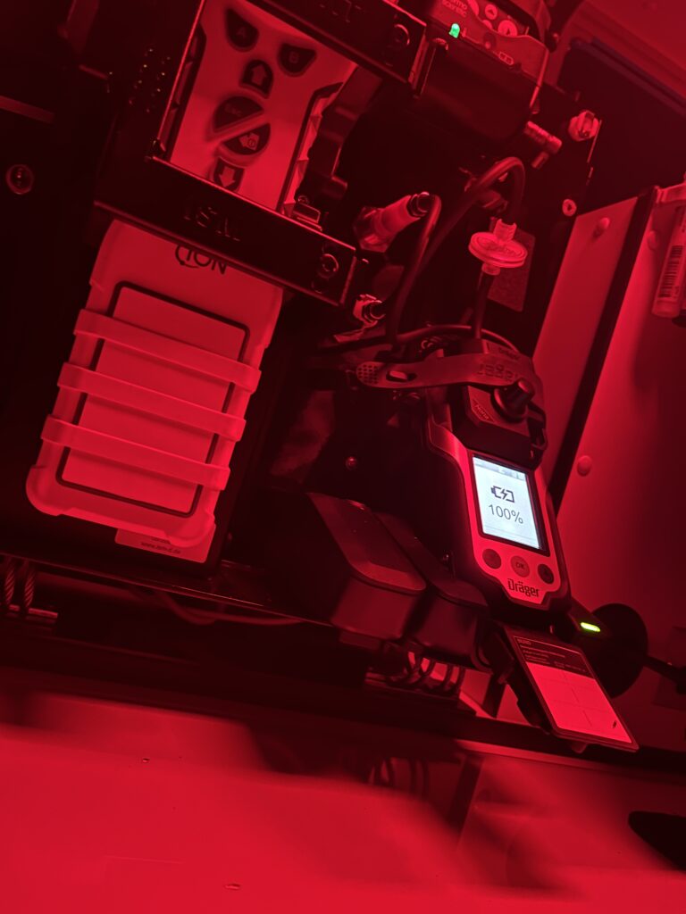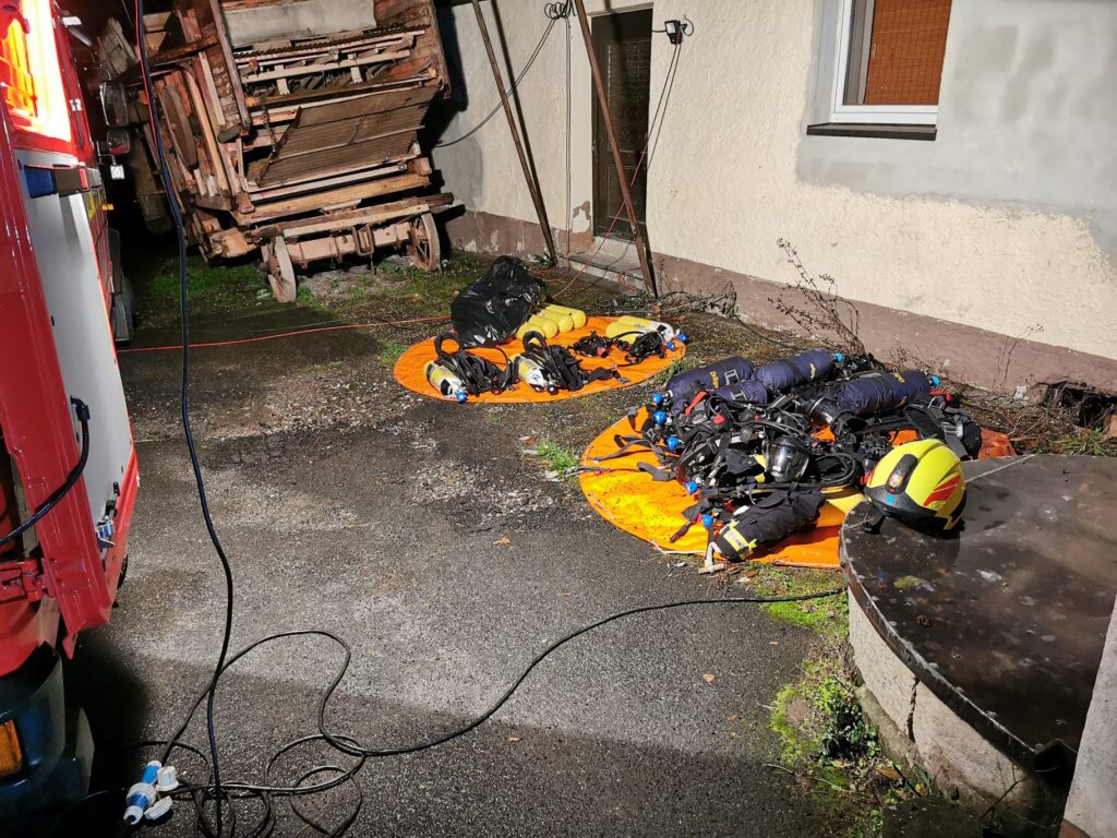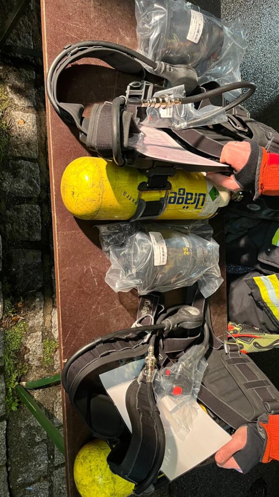 Vor Ort war unsere Aufgabe die eingesetzten Atemschutztrupps mit ausreichend Atemluft zu versorgen. Hierfür wurden die Einsatzkräfte mit den Geräten und Atemluftflaschen aus unserem Gerätewagen Atemschutz/Strahlenschutz versorgt.